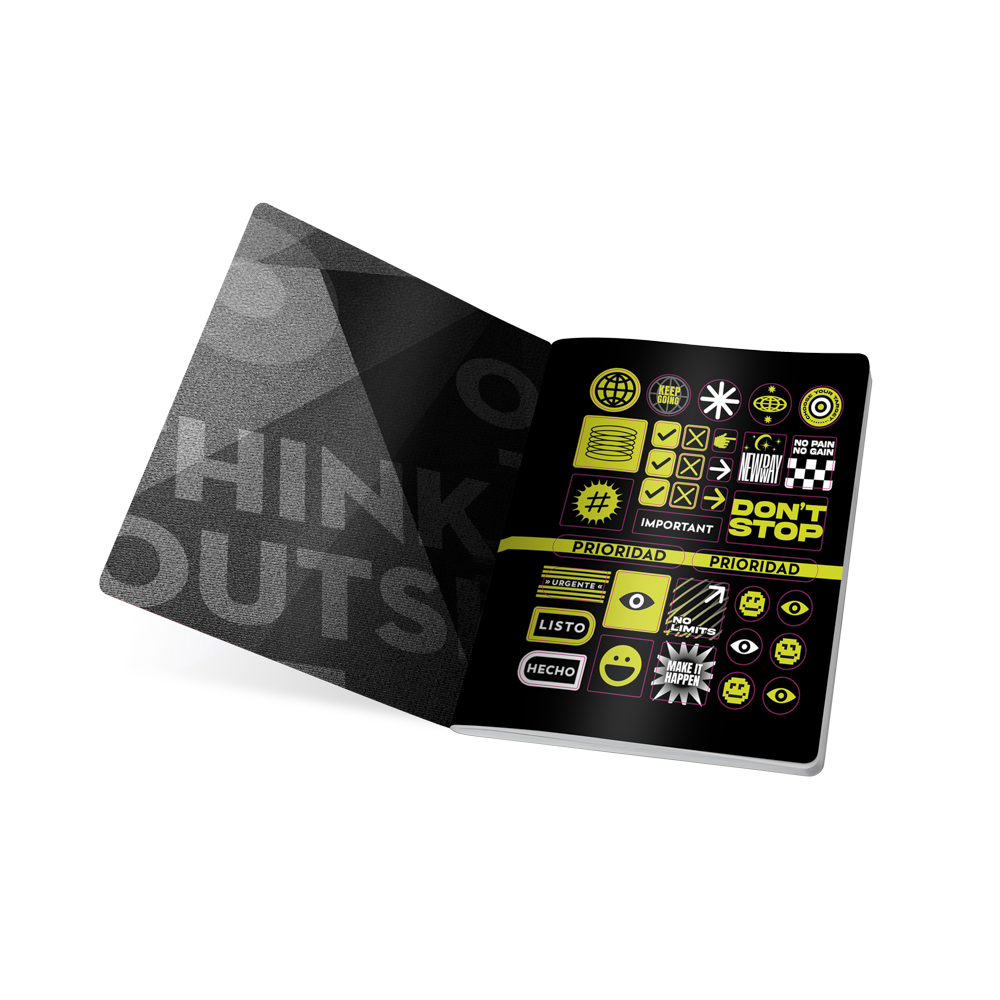Ligero, elegante y funcional: el complemento perfecto para tu rutina." Toma el control de tus ideas con un cuaderno que refleja tu estilo sobrio. Cuaderno cosido con costura ultra resistente protegida con cinta lomo en color para evitar desprendimientos, hoja de stickers con variedad de diseños y formas, reverso decorado, guardas impresas, carátulas más rígidas con diseños novedosos, acabados metalizados y UV Mate resistentes a salpiques de agua.