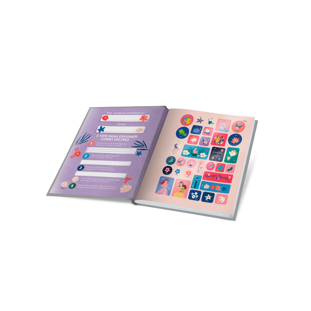 Cuaderno cosido pasta dura con costura ultra resistente, hoja de stickers con variedad de diseños y formas, reverso decorado, guardas impresas, carátulas más rígidas con diseños novedosos, decorados internos, acabados metalizados y UV Mate resistentes a salpiques de agua.