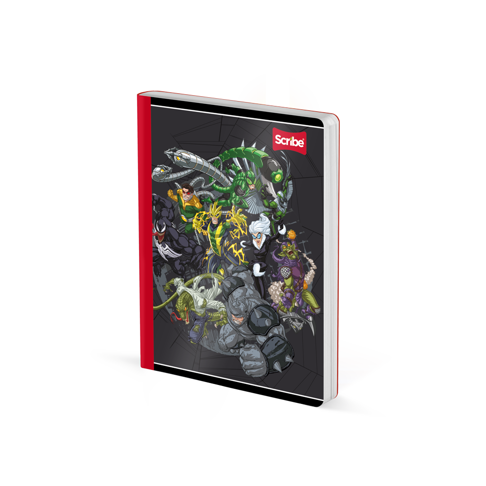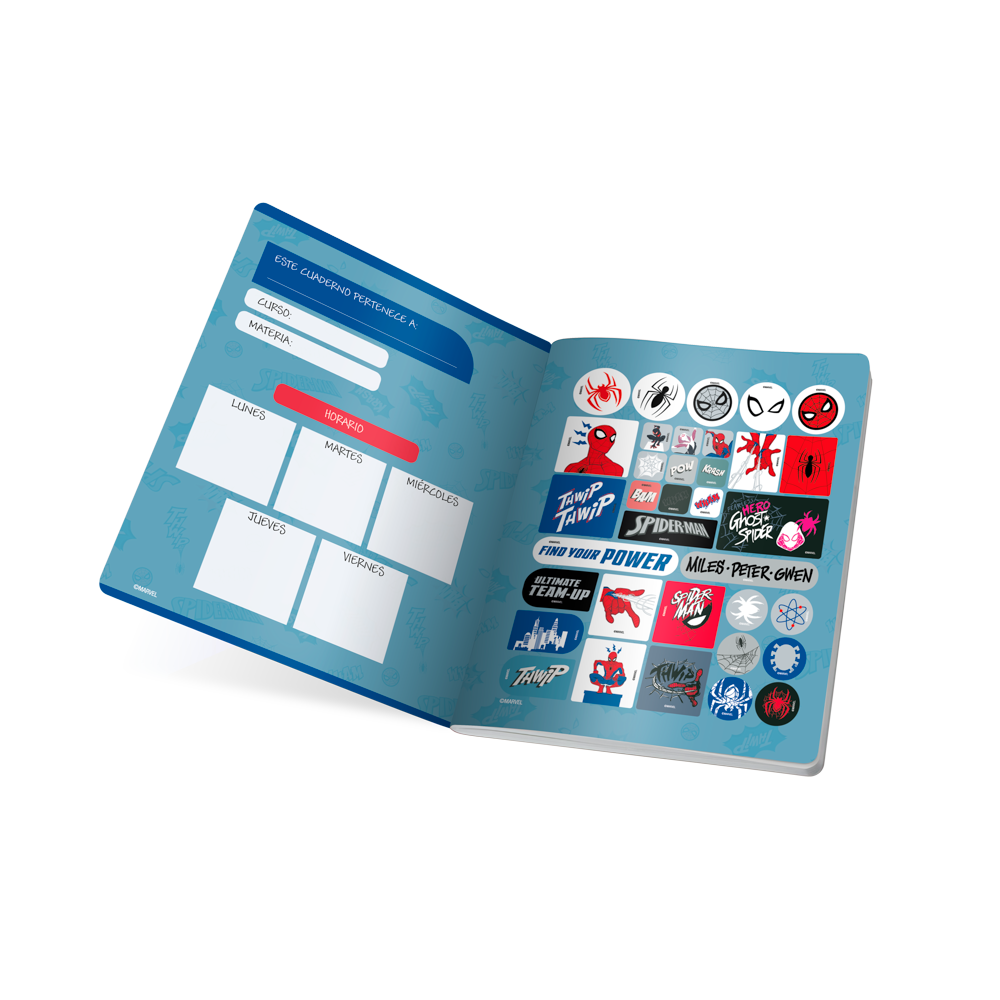 Los nuevos cuadernos de Spiderman está aquí para acompañarte en cada tarea y proyecto, no dejes que se escapen tus ideas. Cuaderno cosido con costura ultra resistente protegida con cinta lomo en color para evitar desprendimientos, hoja de stickers con variedad de diseños y formas, reverso decorado, guardas impresas, carátulas más rígidas con diseños novedosos, acabados metalizados y UV Mate resistentes a salpiques de agua.